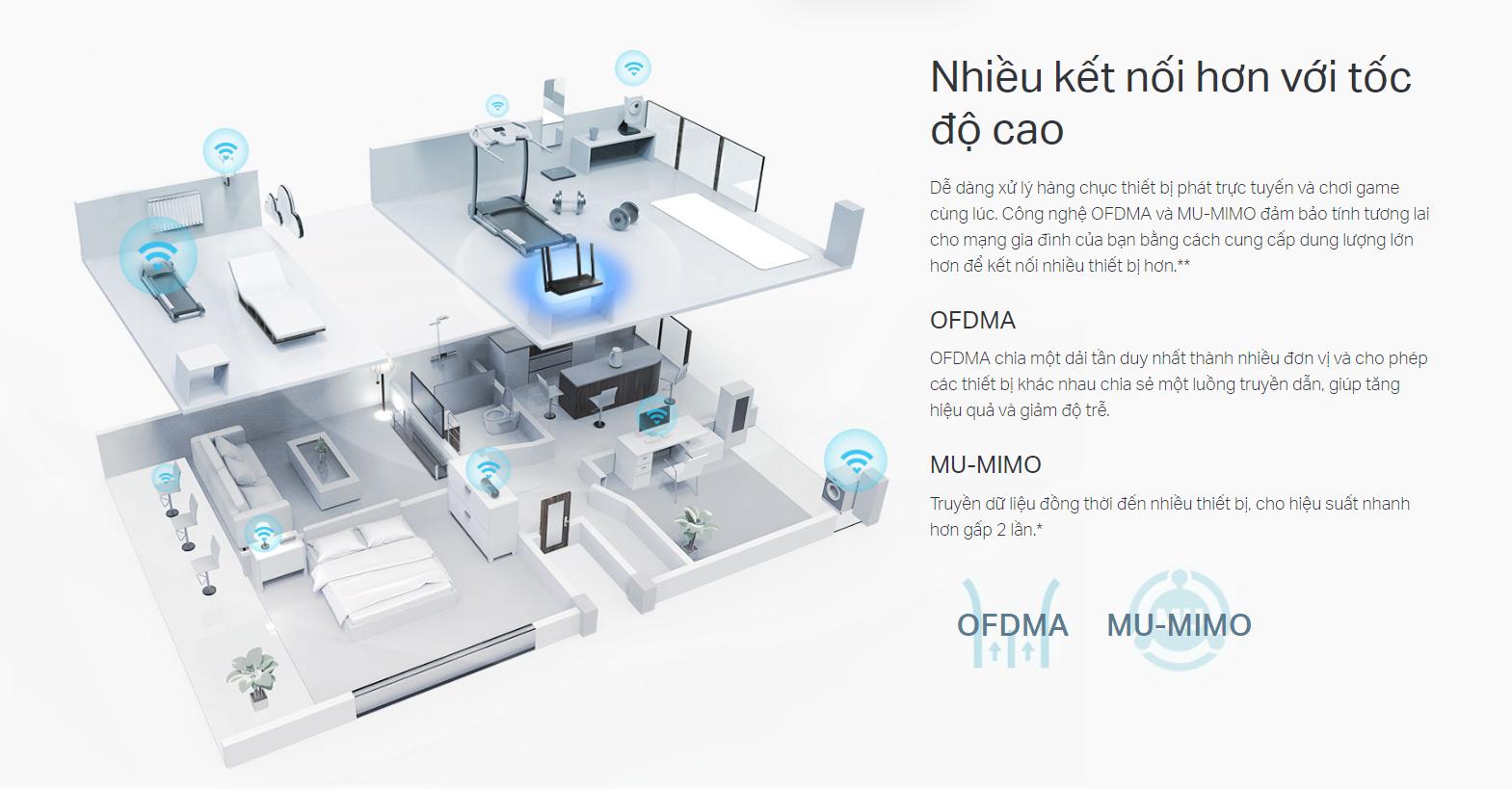 Nhờ tích hợp công nghệ OFDMA và MU-MIMO, router có khả năng chia sẻ băng thông hiệu quả hơn, giúp nhiều thiết bị có thể kết nối cùng lúc mà không gây ra hiện tượng nghẽn mạng. Điều này đặc biệt hữu ích trong các gia đình hoặc văn phòng có nhiều thiết bị thông minh như điện thoại, máy tính bảng, máy tính xách tay và TV thông minh.