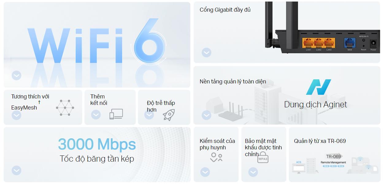 Quản lý: Hỗ trợ ứng dụng Aginet và các giao thức quản lý từ xa cho nhà mạng (TR-069).