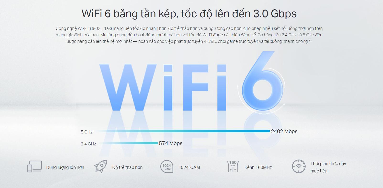 Chuẩn Wi-Fi: Wi-Fi 6, tổng tốc độ AX3000 (2402 Mbps trên 5GHz và 574 Mbps trên 2.4GHz).