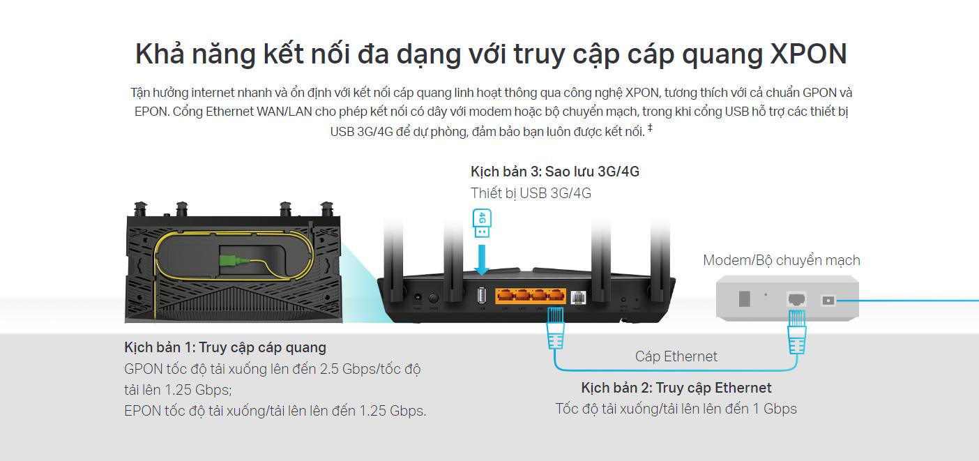 Một trong những điểm nổi bật của TP-Link XX530v là khả năng hỗ trợ cả hai chuẩn kết nối XPON (GPON và EPON). Điều này giúp thiết bị tương thích với nhiều nhà cung cấp dịch vụ internet khác nhau, mang lại sự linh hoạt và tiện lợi cho người dùng.