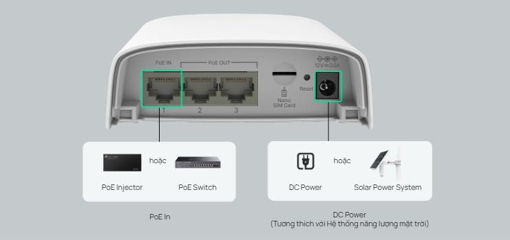 Tp-Link Omada ER703WP-4G-Outdoor hỗ trợ cấp nguồn qua Ethernet (PoE+), giúp giảm thiểu việc sử dụng dây nguồn riêng biệt, đồng thời linh hoạt hơn trong việc lắp đặt ở các vị trí khó tiếp cận nguồn điện.