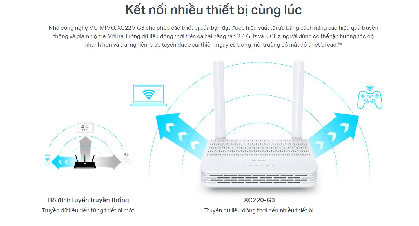 Nhờ công nghệ MU-MIMO, TP-Link XC220-G3 có khả năng xử lý nhiều kết nối cùng lúc mà không ảnh hưởng đến tốc độ mạng. Điều này rất hữu ích trong các gia đình đông người hoặc văn phòng có nhiều thiết bị truy cập Internet cùng lúc.