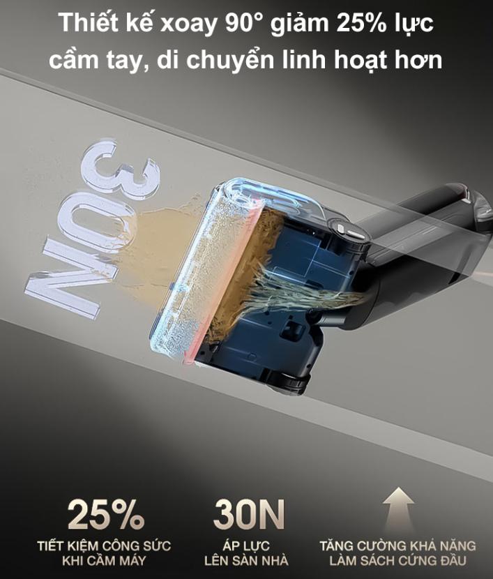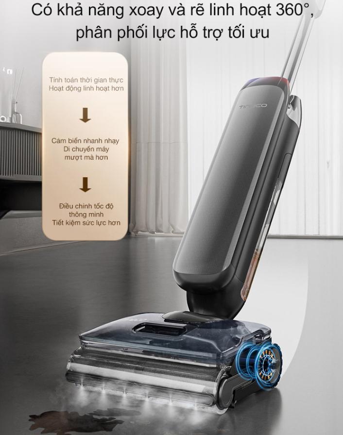 Hệ thống bánh xe AI mô phỏng vi sai ô tô cho phép máy xoay và rẽ 360 độ cực kỳ linh hoạt. Công nghệ này tự động điều chỉnh tốc độ bánh xe theo chuyển động đẩy và kéo của người dùng, giúp máy vận hành trơn tru và nhẹ nhàng, giảm thiểu đáng kể sức lực khi bạn dọn dẹp nhà cửa.
