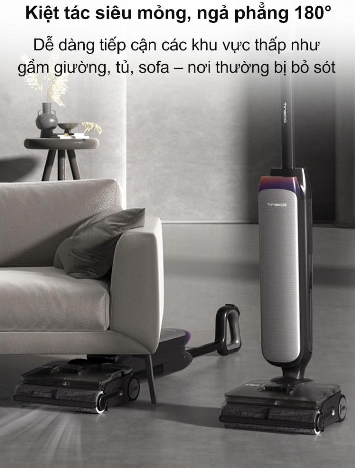 Không cần phải cúi người hay di chuyển đồ đạc nặng nề. Với công nghệ HyperStretch độc đáo, thân máy có thể ngả phẳng 180 độ, kết hợp với thiết kế mỏng chỉ 12.85 cm, giúp máy dễ dàng luồn sâu vào các khu vực khó tiếp cận như gầm giường, gầm tủ, hoặc dưới ghế sofa. Mọi ngóc ngách trong nhà đều được làm sạch triệt để.