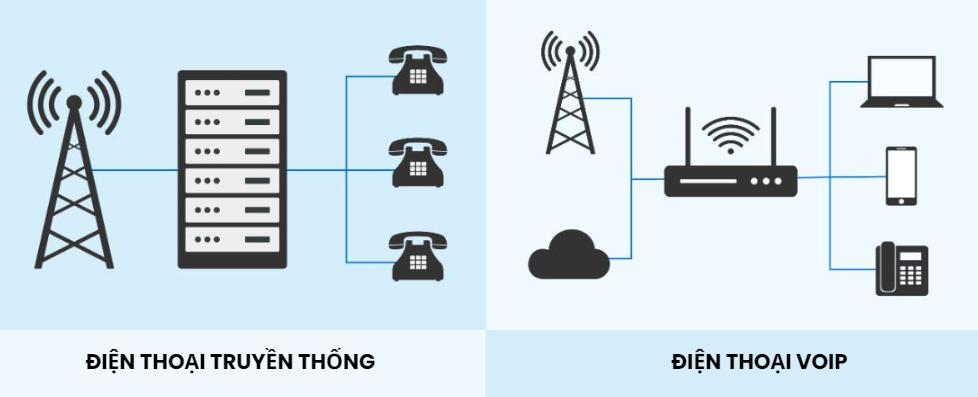- Điện thoại truyền thống: Hoạt động dựa trên hệ thống mạng điện thoại chuyển mạch công cộng (PSTN), sử dụng tín hiệu analog và đường dây cáp đồng vật lý để truyền tải giọng nói. Tín hiệu này chỉ có thể truyền đi trên một đường dây riêng biệt và được xử lý tại các tổng đài PBX cồng kềnh.