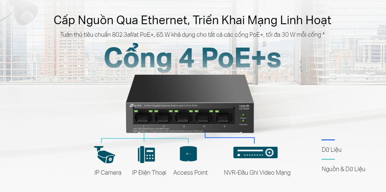 Switch 5 cổng Gigabit TP-Link LS105GP hỗ trợ công nghệ PoE+ trên 4 cổng, với tổng công suất PoE lên đến 65W. Điều này cho phép cung cấp nguồn điện trực tiếp cho các thiết bị như camera IP, điểm truy cập Wi-Fi hoặc điện thoại VoIP mà không cần sử dụng thêm bộ nguồn riêng biệt, giúp tiết kiệm chi phí và giảm thiểu sự phức tạp khi lắp đặt.