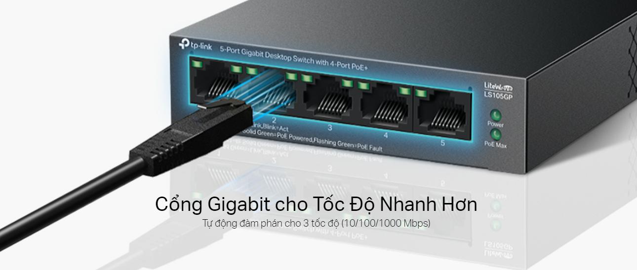 LS105GP được trang bị 5 cổng Gigabit Ethernet, cung cấp tốc độ truyền tải dữ liệu lên đến 10/100/1000 Mbps. Điều này giúp đảm bảo khả năng kết nối nhanh chóng và ổn định, phù hợp cho các ứng dụng yêu cầu băng thông cao như truyền phát video HD, chơi game trực tuyến, hoặc chia sẻ dữ liệu lớn.