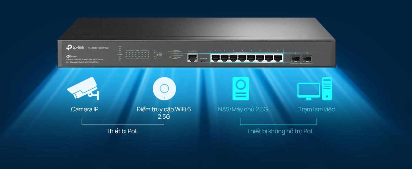 Switch SG3210XHP-M2 được trang bị 8 cổng PoE+ với tốc độ lên đến 2.5Gbps trên mỗi cổng. Điều này cho phép truyền tải dữ liệu nhanh chóng và ổn định, đáp ứng nhu cầu của các thiết bị hiện đại như camera IP, điểm truy cập Wi-Fi 6, và các thiết bị IoT. Tính năng PoE+ (802.3at/af) cũng hỗ trợ cung cấp nguồn điện trực tiếp qua cáp mạng, giúp giảm thiểu việc sử dụng dây nguồn riêng biệt.