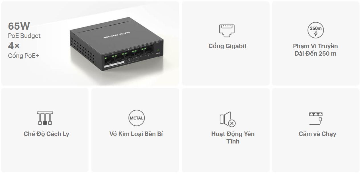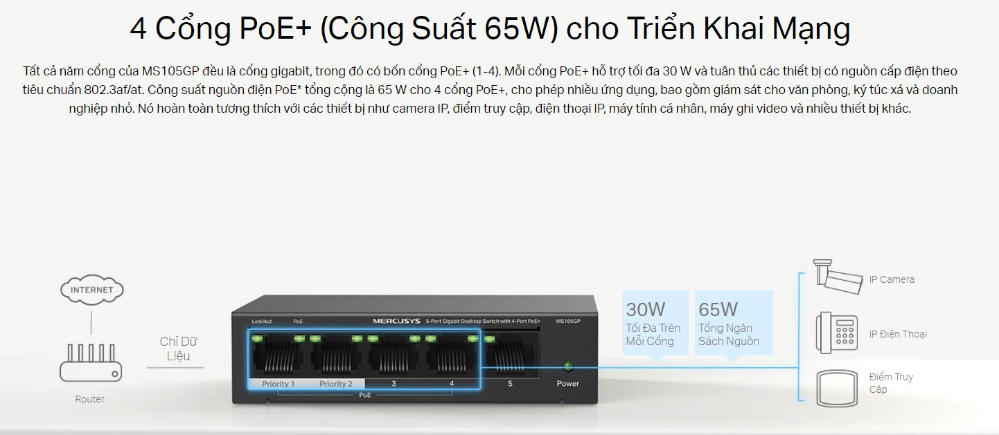 Một trong những tính năng đáng chú ý nhất của Mercusys MS105GP là khả năng truyền tải cả dữ liệu và nguồn điện qua cùng một dây cáp nhờ vào 4 cổng PoE+ (Power over Ethernet). Điều này không chỉ giúp tiết kiệm chi phí mua thêm dây cáp mà còn giảm thiểu sự rắc rối khi lắp đặt, đặc biệt trong các không gian nhỏ hẹp hoặc khó tiếp cận nguồn điện.