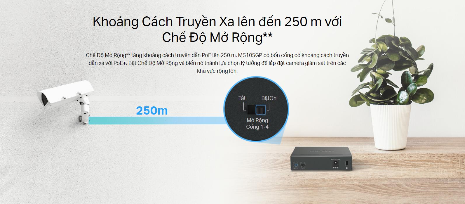 Với chế độ Mở Rộng, Mercusys MS105GP có thể tăng khoảng cách truyền tải PoE lên đến 250 mét, gấp nhiều lần so với phạm vi thông thường. Đây là một tính năng lý tưởng cho các hệ thống giám sát an ninh hoặc các khu vực cần kết nối mạng ở khoảng cách xa.