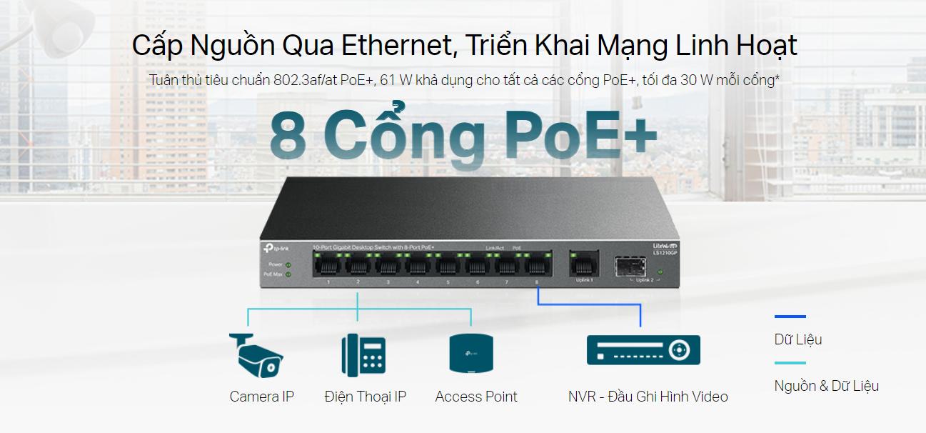 Một trong những tính năng nổi bật của TP-Link LS1210GP là khả năng hỗ trợ PoE (Power over Ethernet). Thiết bị có 8 cổng PoE+ gigabit tương thích chuẩn IEEE 802.3af/at, cung cấp nguồn điện và kết nối dữ liệu qua cùng một dây cáp. Mỗi cổng PoE hỗ trợ đầu ra lên tới 30 W, giúp dễ dàng cấp nguồn cho các thiết bị như camera IP, điểm truy cập Wi-Fi (access point), và điện thoại IP mà không cần dây nguồn riêng biệt.