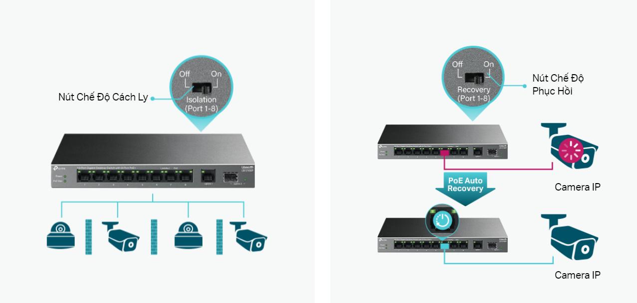 Với tính năng tự động phục hồi PoE, switch có thể tự động khởi động lại các thiết bị hỗ trợ PoE khi chúng bị rơi hoặc không phản hồi. Điều này giúp giảm thiểu thời gian gián đoạn và đảm bảo hệ thống hoạt động ổn định mà không cần can thiệp thủ công.