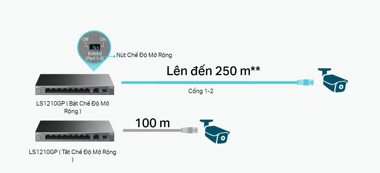 Ở chế độ mở rộng, TP-Link LS1210GP cho phép khoảng cách truyền PoE lên tới 250m, vượt xa giới hạn thông thường của cáp Ethernet. Tính năng này đặc biệt hữu ích trong việc triển khai các thiết bị giám sát ở những khu vực rộng lớn như nhà xưởng, bãi đỗ xe hay công viên.