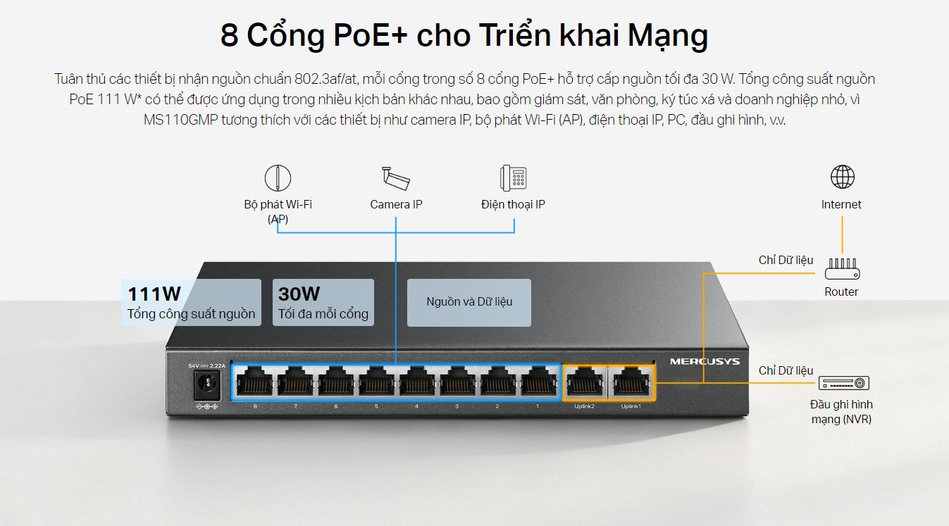 Một trong những tính năng đáng chú ý của MS110GMP là hỗ trợ chuẩn PoE+ trên 8 cổng Ethernet. Với tổng công suất PoE lên đến 150W, switch có thể cấp nguồn trực tiếp cho các thiết bị như camera IP, điểm truy cập không dây (Access Point) hoặc điện thoại IP mà không cần sử dụng thêm dây nguồn riêng biệt. Điều này giúp giảm thiểu chi phí lắp đặt và đơn giản hóa hệ thống mạng.