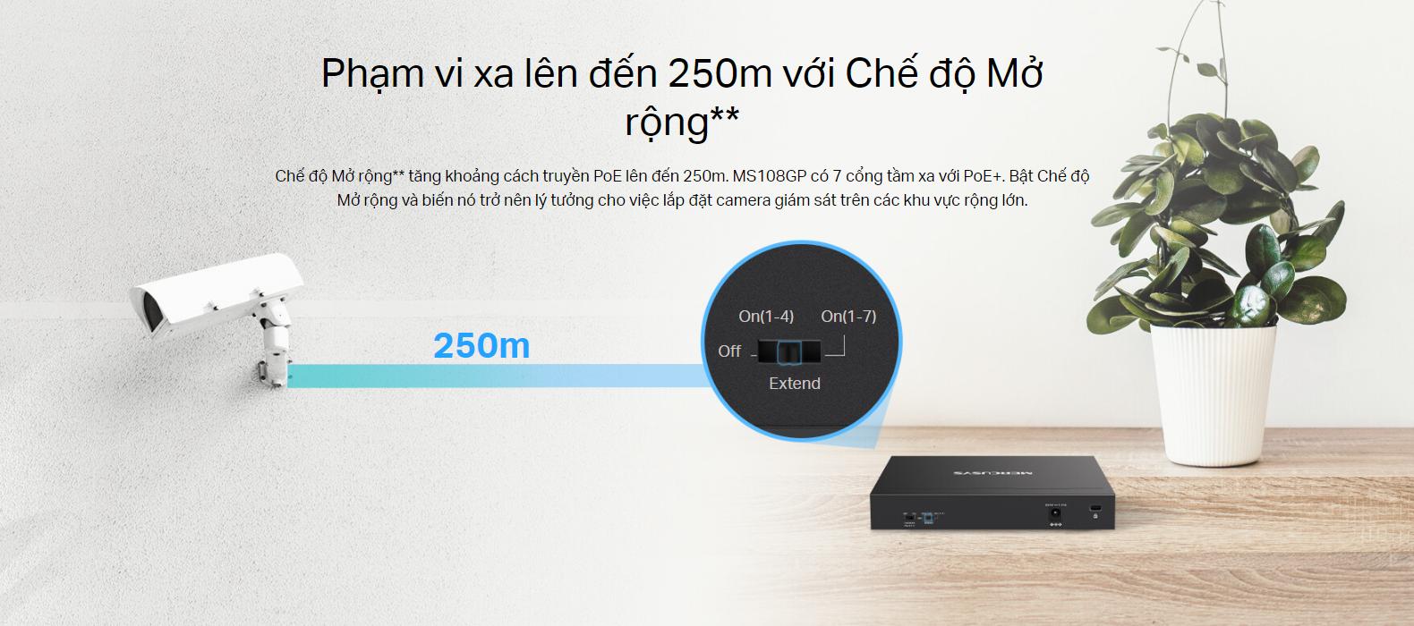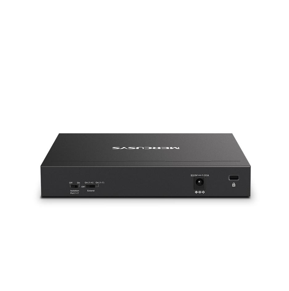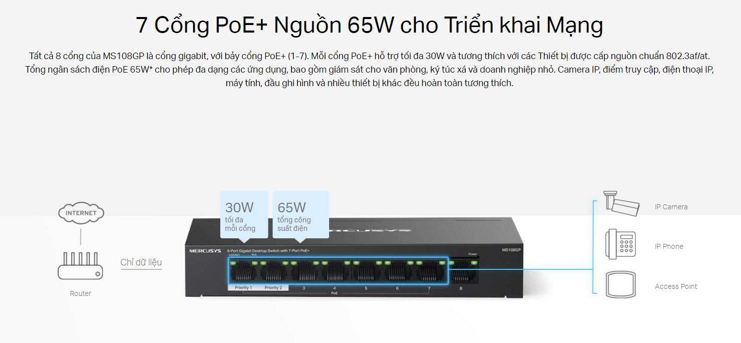Mercusys MS108GP được trang bị 7 cổng PoE+ (Power over Ethernet Plus), cho phép truyền tải dữ liệu và cung cấp nguồn điện qua một cáp mạng duy nhất. Tính năng này rất hữu ích khi sử dụng với các thiết bị như camera IP, điểm truy cập Wi-Fi hoặc điện thoại IP mà không cần dây nguồn riêng, giúp tiết kiệm chi phí và đơn giản hóa việc lắp đặt.