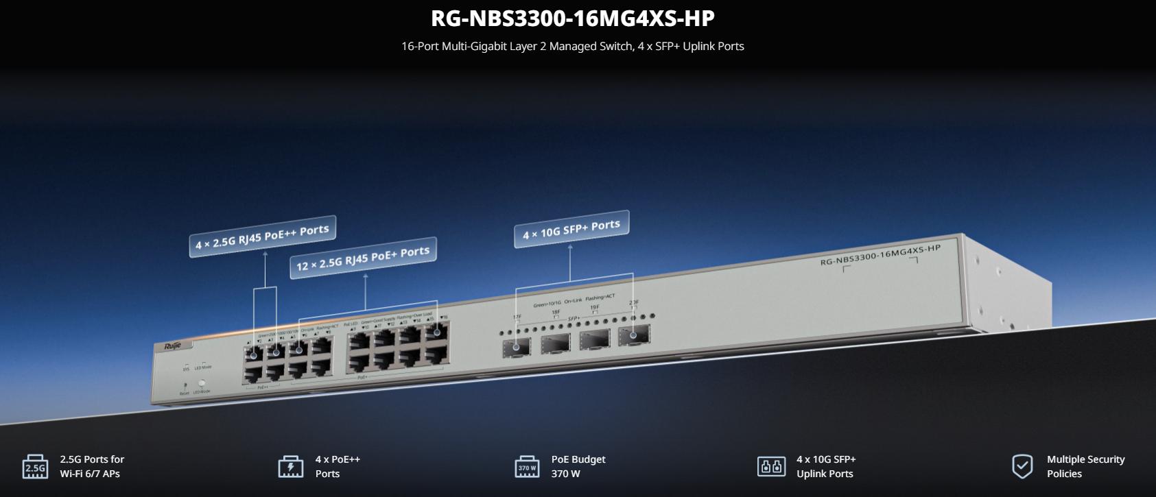 Switch RG-NBS3300-16MG4XS-HP được trang bị 16 cổng PoE+ (Power over Ethernet) với tổng công suất lên đến 370W. Điều này cho phép thiết bị cung cấp nguồn điện trực tiếp cho các thiết bị mạng như camera IP, Access Point không dây hoặc điện thoại IP mà không cần sử dụng thêm bộ cấp nguồn riêng biệt. Tính năng này giúp giảm thiểu chi phí và đơn giản hóa việc triển khai hệ thống mạng.