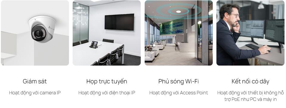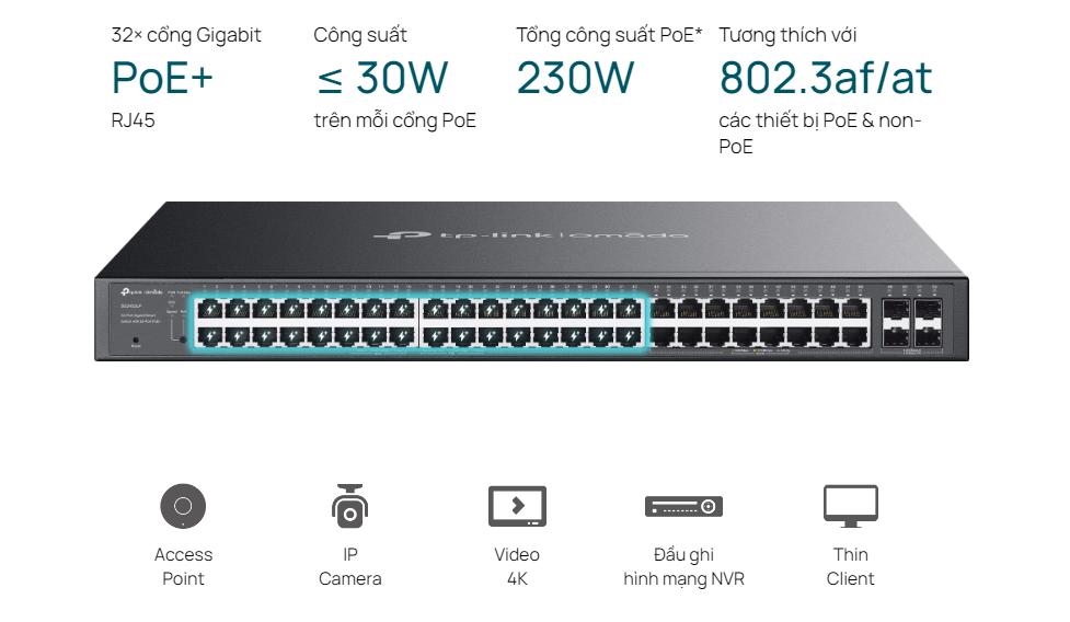 Switch Smart Managed 52 Cổng hỗ trợ chuẩn PoE+ (802.3at/af) với tổng công suất lên đến 384W, cho phép cung cấp nguồn điện trực tiếp qua cáp mạng đến các thiết bị như camera IP, điểm truy cập không dây (AP), và điện thoại VoIP. Điều này giúp giảm thiểu chi phí triển khai và tối ưu hóa việc quản lý nguồn điện.