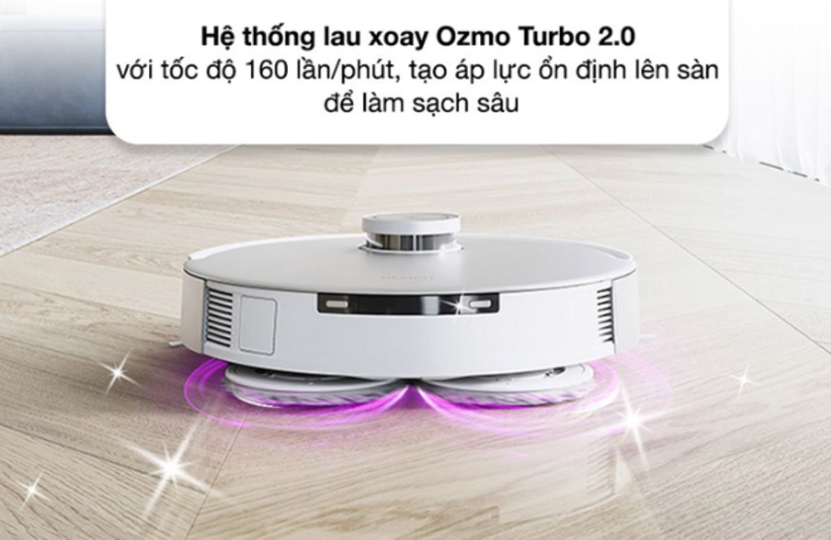 Công nghệ Ozmo Turbo 2.0 sử dụng động cơ tân tiến với tốc độ xoay 160 vòng/phút và lực nhấn 6 N, giúp tăng ma sát giữa giẻ lau và sàn. Nhờ đó, robot có thể đánh bay các vết bẩn cứng đầu, kể cả vết cà phê để lâu ngày, mang lại hiệu quả làm sạch sâu vượt trội trên mọi loại sàn.