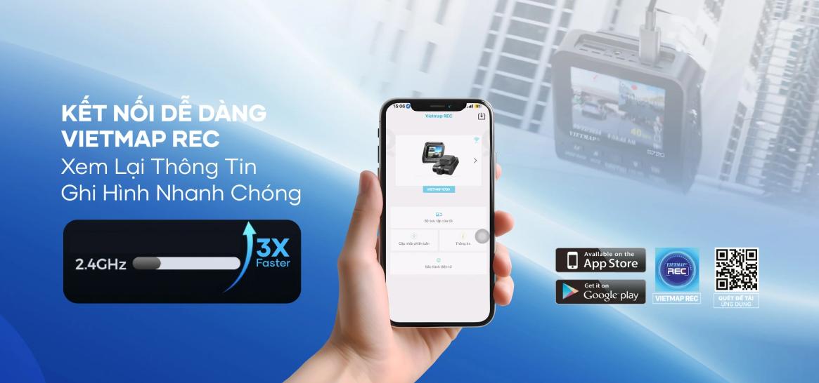 Ngoài ra, với kết nối WiFi nội bộ, người dùng có thể dễ dàng kết nối camera với điện thoại qua ứng dụng Vietmap REC để xem video trực tiếp, tải video/hình ảnh hoặc tùy chỉnh cài đặt từ xa một cách nhanh chóng và tiện lợi mà không cần tháo thẻ nhớ.