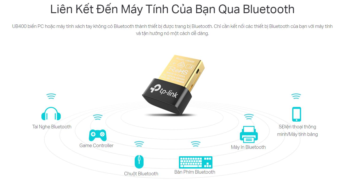 UB400 hỗ trợ kết nối với nhiều loại thiết bị khác nhau như tai nghe không dây, loa Bluetooth, bàn phím, chuột không dây, smartphone và thậm chí cả máy in. Điều này giúp bạn dễ dàng mở rộng khả năng kết nối của máy tính để bàn hoặc laptop.
