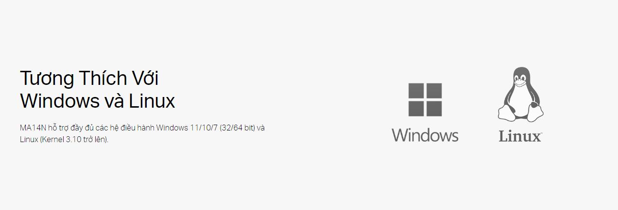 Mercusys MA14N tương thích với nhiều hệ điều hành phổ biến như Windows 10/11, giúp bạn dễ dàng cài đặt và sử dụng mà không gặp phải bất kỳ trở ngại nào.