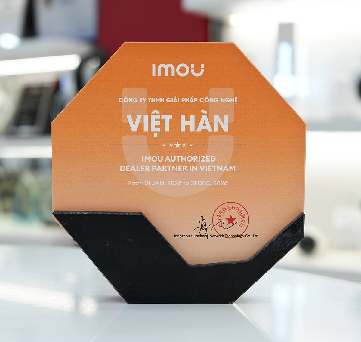 Chứng nhận do Hangzhou Huacheng Network Technology Co., Ltd. – đơn vị sở hữu thương hiệu IMOU – ban hành, xác nhận Việt Hàn Security là đối tác phân phối chính thức các sản phẩm IMOU tại thị trường Việt Nam trong năm 2026.